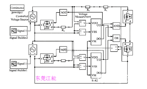 根據(jù)上述均衡充電保護(hù)板電路工作的基本原理,在Matlab/Simulink環(huán)境下搭建了系統(tǒng)仿真模型,模擬鋰電池組充放電過程中保護(hù)板工作的情況,驗(yàn)證該設(shè)計(jì)方案的可行性。為簡單起見,給出了鋰電池組僅由2節(jié)鋰電池串聯(lián)的仿真模型,如圖5所示。