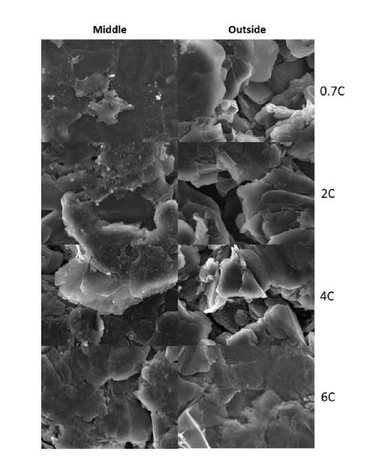 通過(guò)拆解循環(huán)后的電池,隨著充電速率的增加,負(fù)極的顏色也發(fā)生了改變,在0.7C和2C的充電倍率下,電極呈現(xiàn)了均一的顏色,而到充電倍率提高到4C,電極的中間位置呈現(xiàn)出了灰色,而在6C的倍率下,不但中間部分的電極呈現(xiàn)除灰色,中間部分的活性物質(zhì)還出現(xiàn)了脫落的現(xiàn)象。SEM掃描發(fā)現(xiàn),在0.7C和2C的倍率下,電極表面呈現(xiàn)除原始的狀態(tài),但是在4C的倍率下,電極表面開(kāi)始出現(xiàn)一些亮點(diǎn),6C的倍率下,電極的表面狀態(tài)則明顯不同了,由于SEI膜厚度的增加,已經(jīng)難以分辨單獨(dú)的石墨顆粒了。